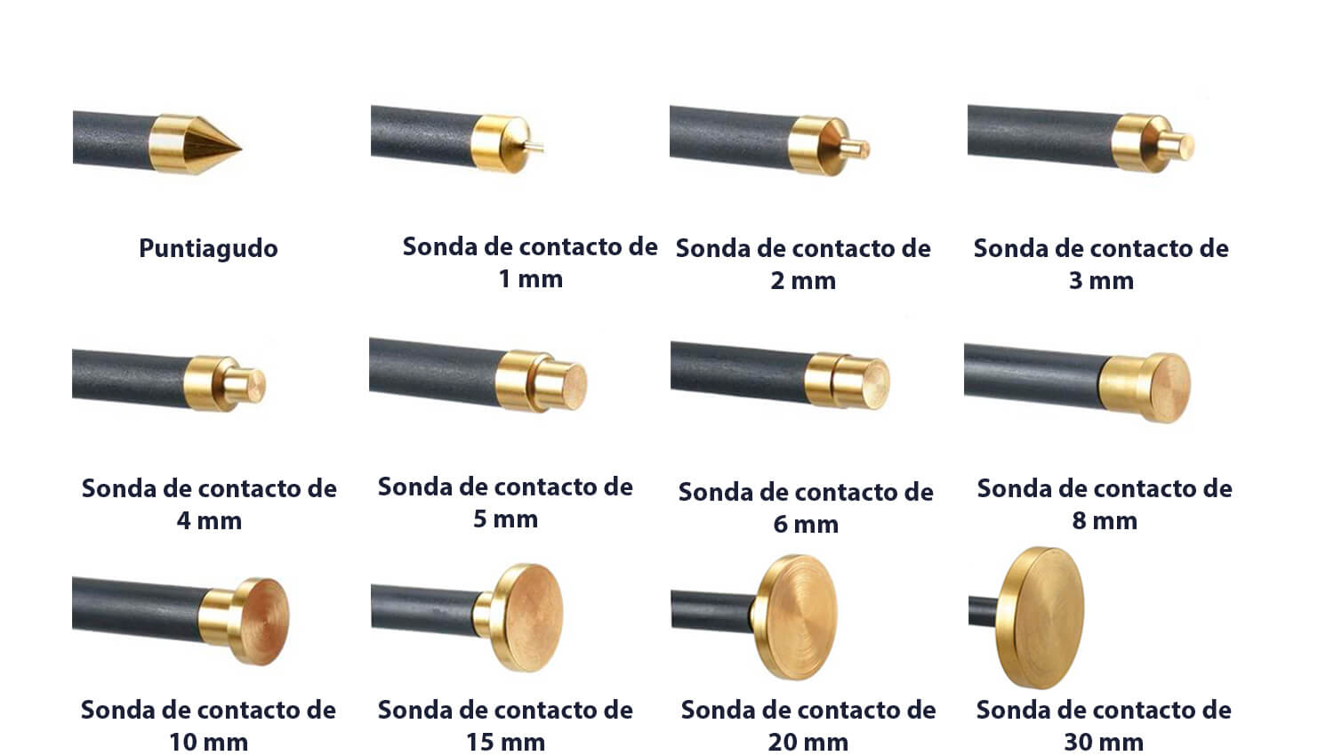 Las sondas de contacto se dividen en tres categorías: sondas pequeñas, medianas y grandes. Todas las sondas están chapadas en oro para facilitar la limpieza.