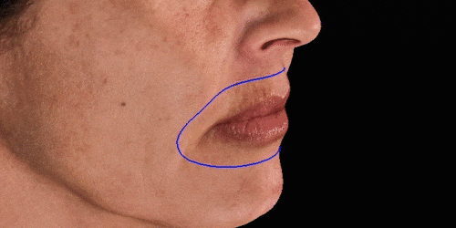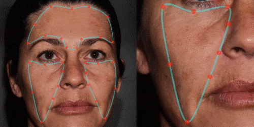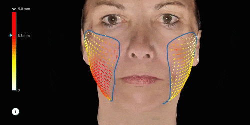Evalúe el estiramiento y estiramiento de la piel en 3D. Evalúe la dirección y la distancia de los estiramientos faciales utilizando indicadores de color.